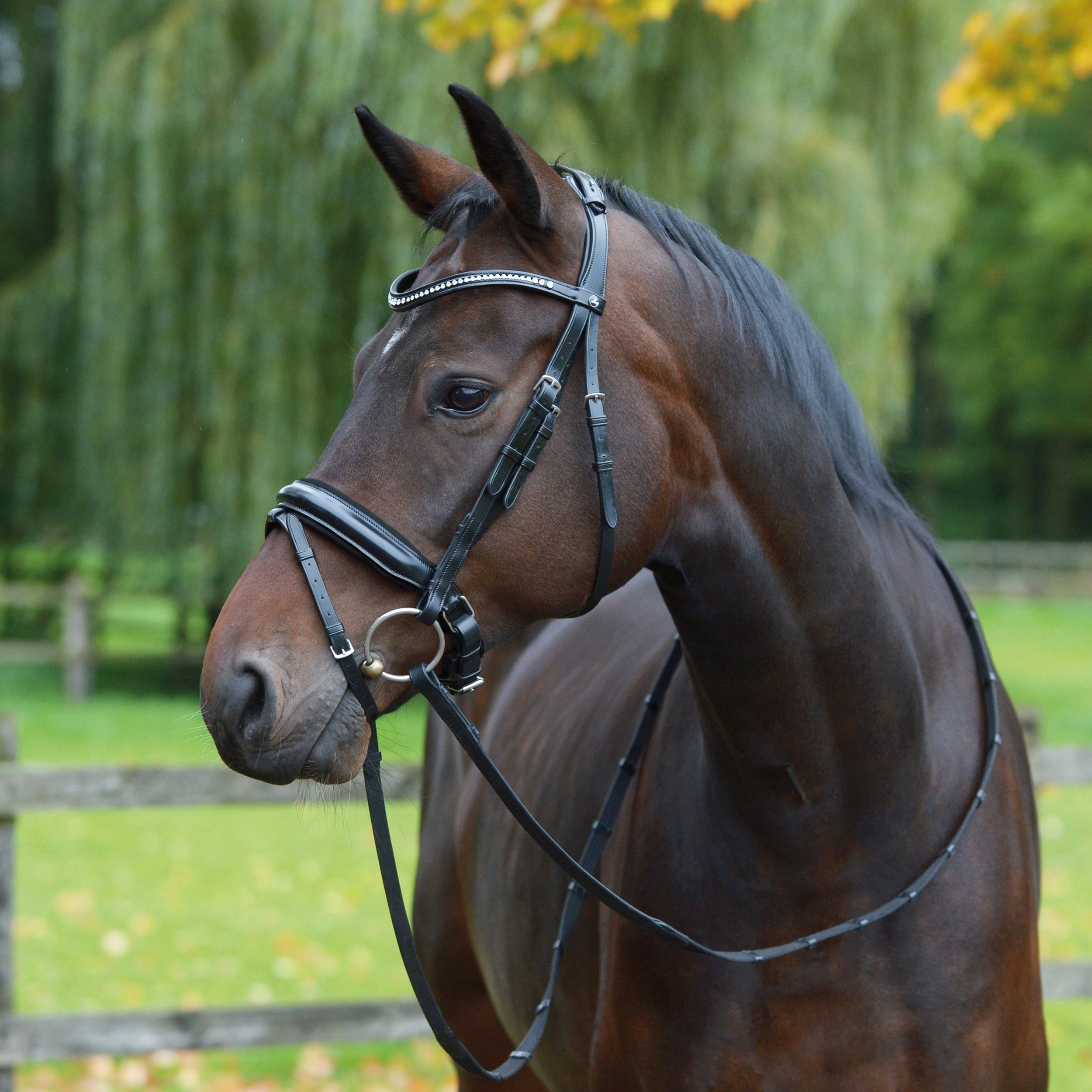 - Schwedisches Reithalfter mit seitlich sich verjüngendem sowie extra breitem, weich unterlegtem Nasenriemen, Rollschnallen und integriertem Kieferpad