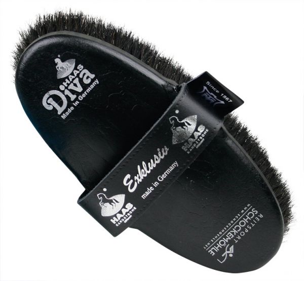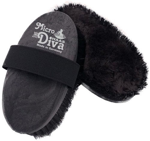 Mattes Lammfell umringt von weichem Rosshaar zeichnet diese Pferdebürste von der Firma Haas aus.