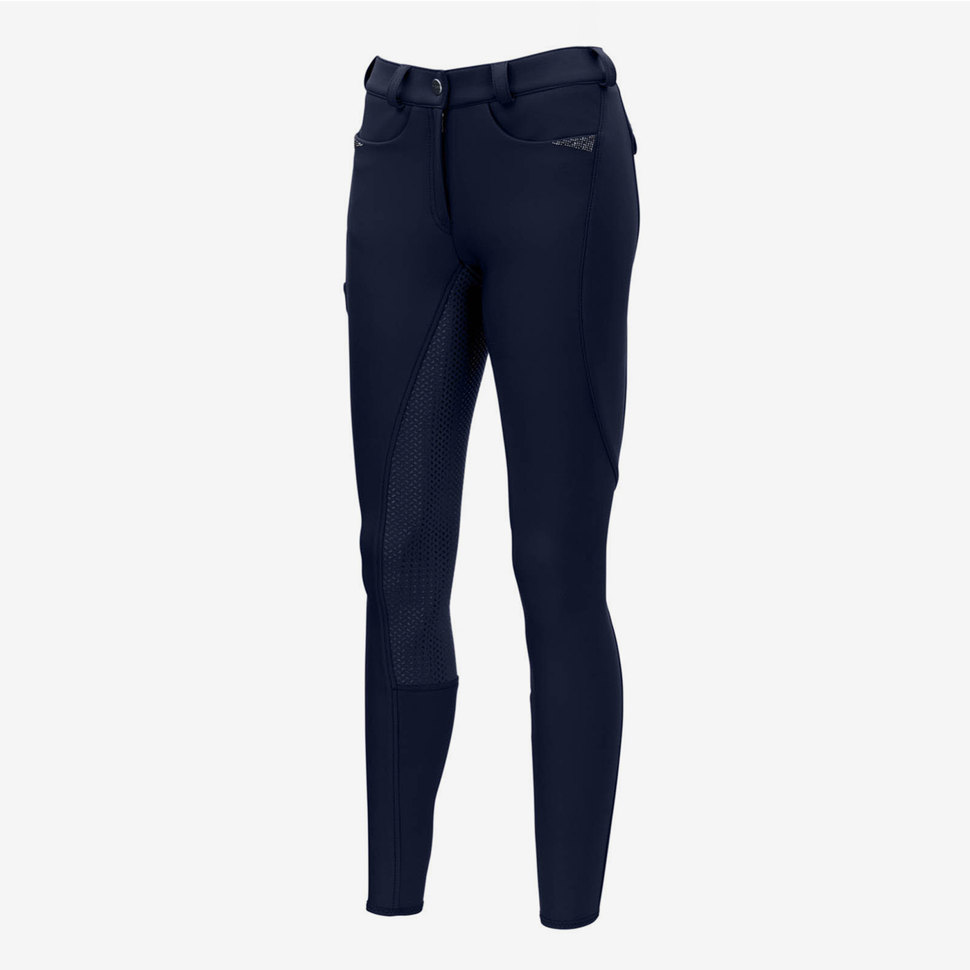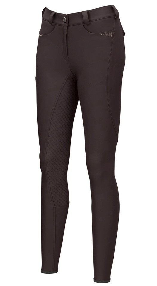 Die warme Softshell Reithose Laure ist aus der Herbst/Winter Kollektion 2021 aus dem Hause Pikeur. Laure besitzt die selben Eigenschaften wie die Basisform, hier mit neuartiger Wintersoftshellware. Sie verfügt über eine sehr gute Wärmefunktion, trotz ihrem geringeren Volumen. Die softe, winterwarme Innenseite sorgt für ein angenehmes Tragegefühl. Außerdem ist die Reithose mit einem Full-Grip aus Silikon ausgestattet wodurch ein sicherer Halt im Sattel garantiert ist. Zusätzlich verfügt sie über eine dynamische Schnittführung mit integrierter Handytasche. Das seitlich, eingesetzte Lurex Bundband gewährt dem Reiter maximalen Tragekomfort. Dadurch ist sie perfekt für das tägliche Training geeignet. Unterhalb des Tascheneingriffs befinden sich dezent, tonige Rhinestone Applikationen sowie am Seitenstreifen ein elegantes Strass-Transfer mit Pikeur Selection.