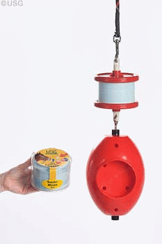 Der rote ovalförmige Ball mit Tastie® Halter wird in die Box, den Stall oder Paddock gehängt.