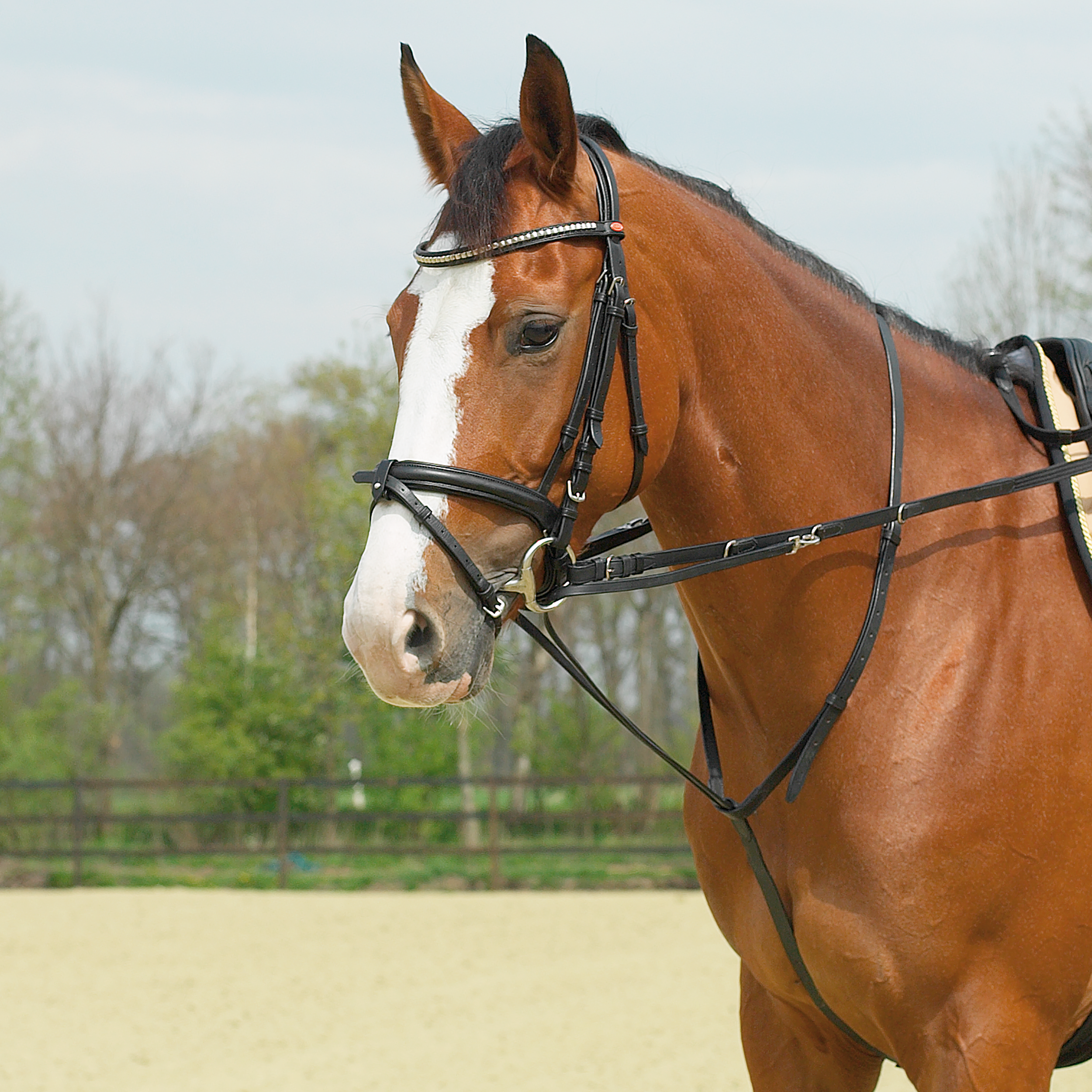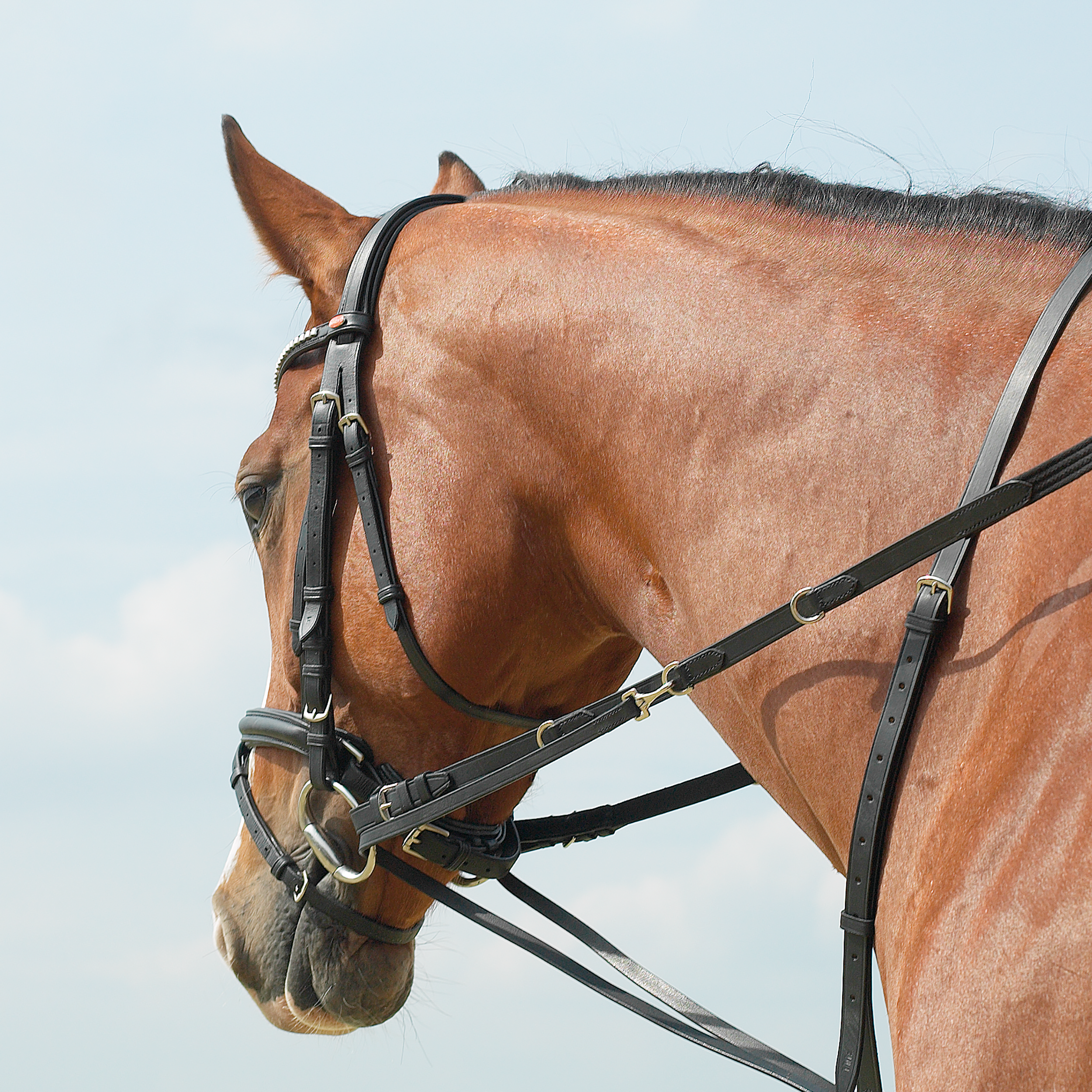 Thiedemann-Zügel (auch Köhler-Zügel) in bester Lederqualität, Sattelgurtabschnitt mit Halsriemen und zwei Snaphaken, Edelstahlbeschläge