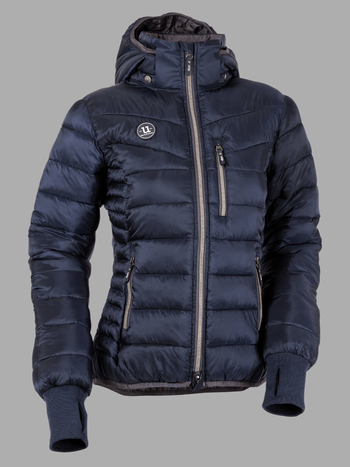 Die Reitjacke hat einen Zwei-Wege-Reißverschluss, abnehmbare Kapuze und verlängerte Ärmel mit Bündchen und Daumenlöchern,