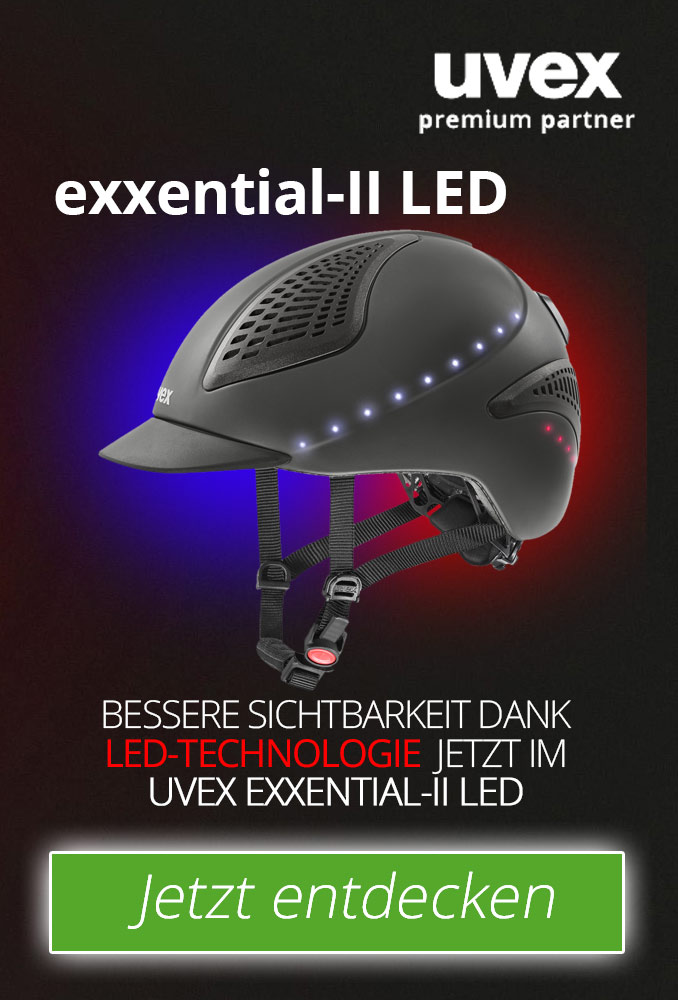 Für Reiter, die bei einem Ausritt in den Abendstunden auf alles vorbereitet sein wollen, ist der uvex exxential II LED der perfekte Helm.