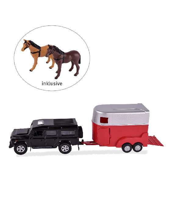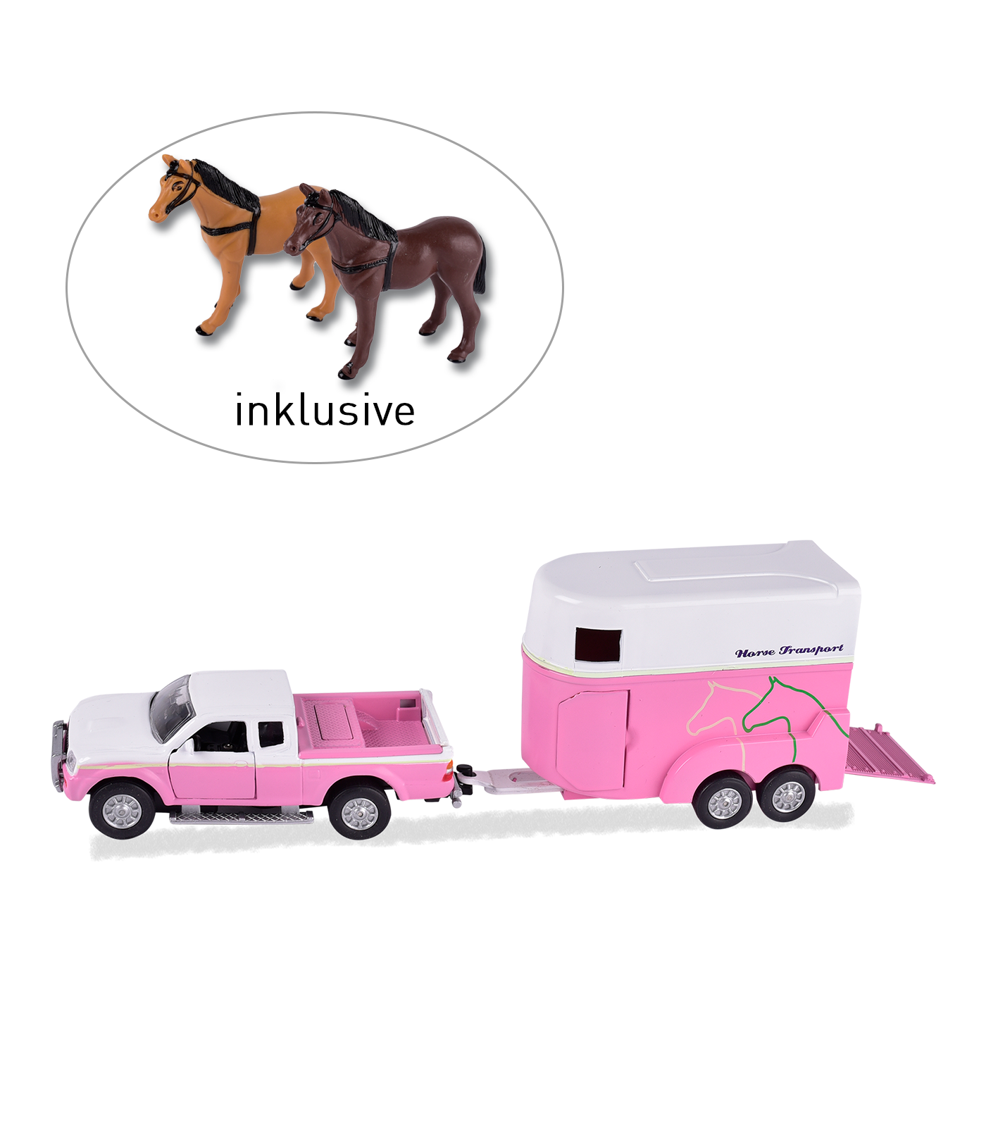 - Mit zwei rassigen Pferden, Pferdetransporter und Fahrzeug mit Pullbackmotor.